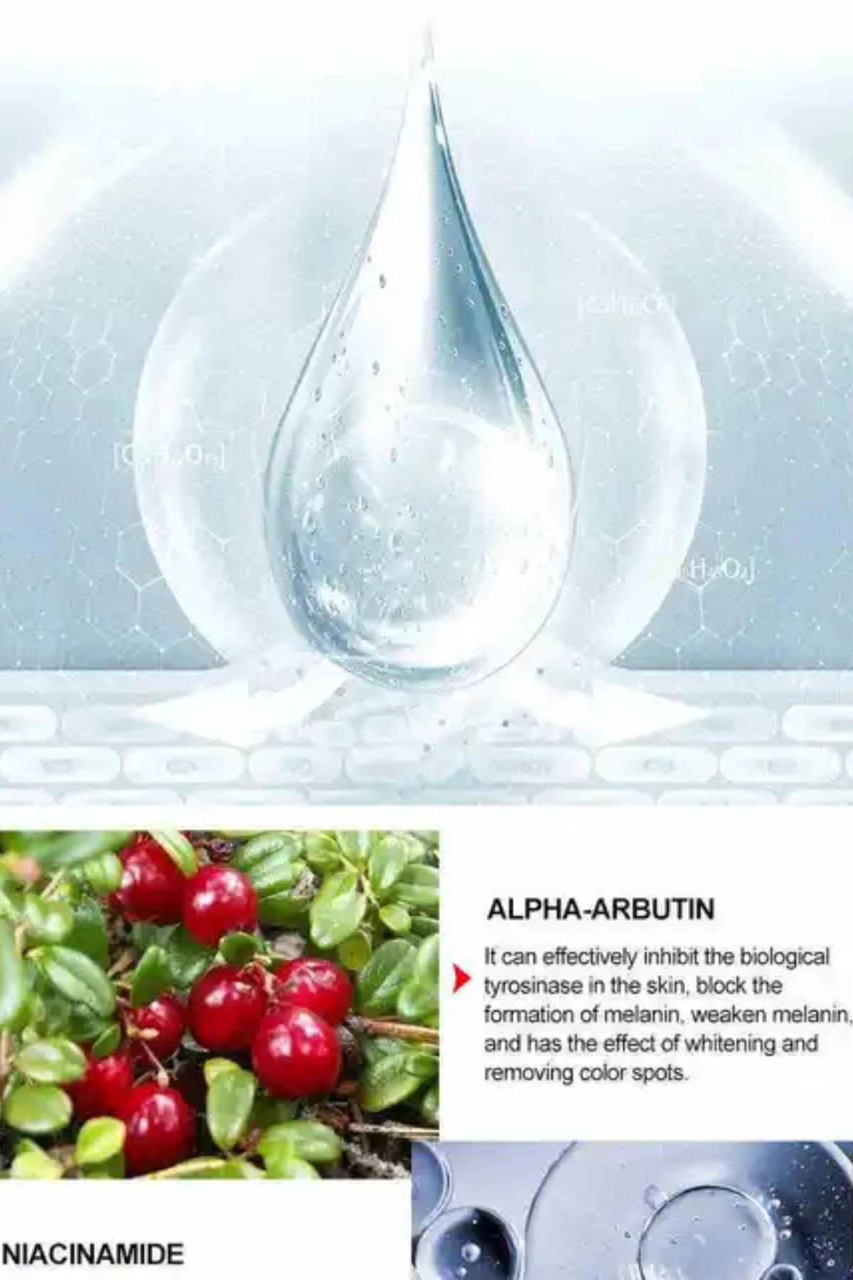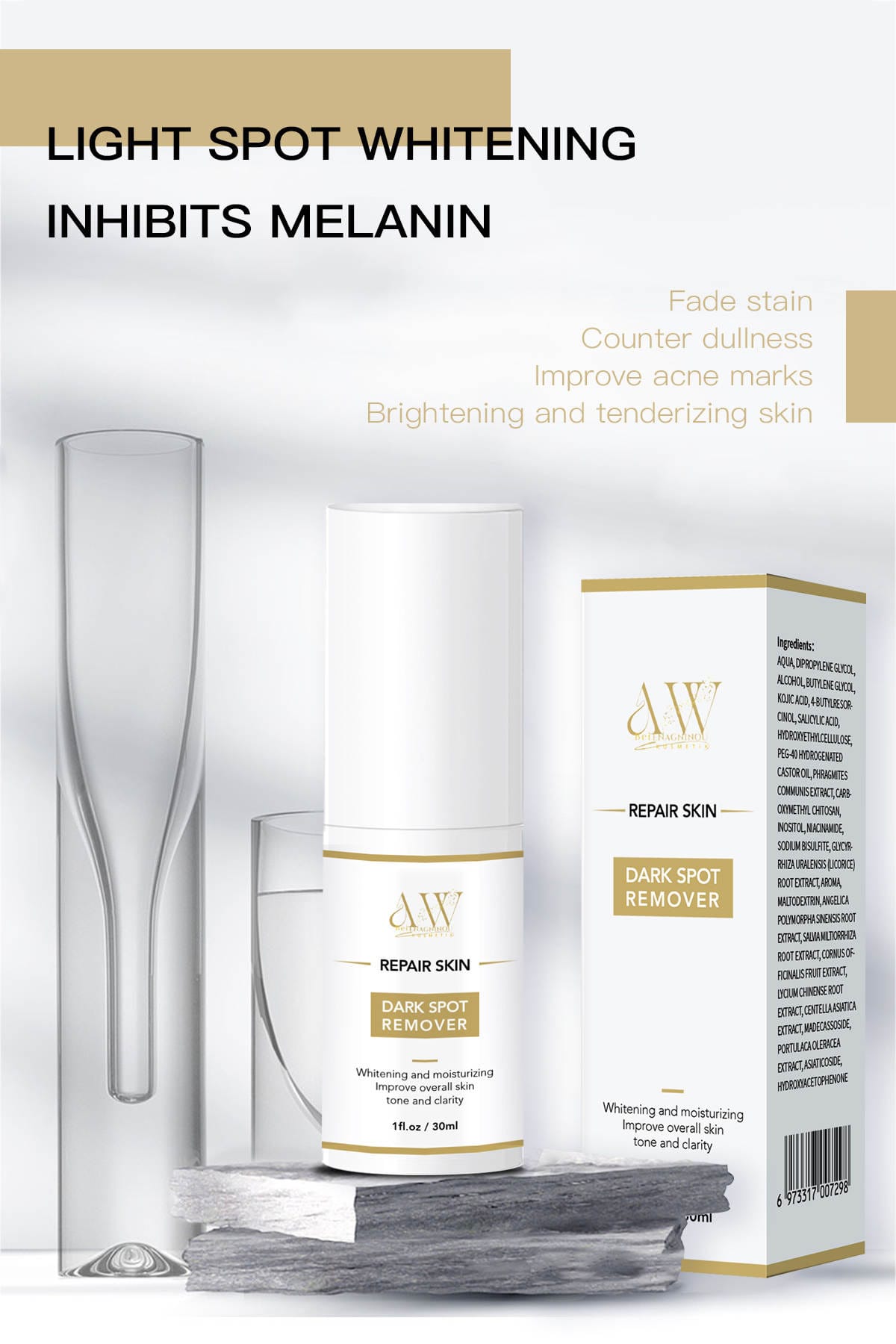 Ingredients: AQUA, DIPROPYLENE GLYCOL, ALCOHOL, BUTYLENE GLYCOL, KOJIC ACID, 4-BUTYLRESOR- CINOL, SALICYLIC ACID, HYDROXYETHYLCELLULOSE, PEG-40 HYDROGENATED CASTOR OIL, PHRAGMITES COMMUNIS EXTRACT, CARB- OXYMETHYL CHITOSAN, INOSITOL, NIACINAMIDE, SODIUM BISULFITE, GLYCYR- RHIZA URALENSIS (LICORICE) ROOT EXTRACT, AROMA, MALTODEXTRIN, ANGELICA POLYMORPHA SINENSIS ROOT EXTRACT, SALVIA MILTIORRHIZA ROOT EXTRACT, CORNUS OF- FICINALIS FRUIT EXTRACT, LYCIUM CHINENSE ROOT EXTRACT, CENTELLA ASIATICA EXTRACT, MADECASSOSIDE, PORTULACA OLERACEA EXTRACT, ASIATICOSIDE, HYDROXYACETOPHENONE
