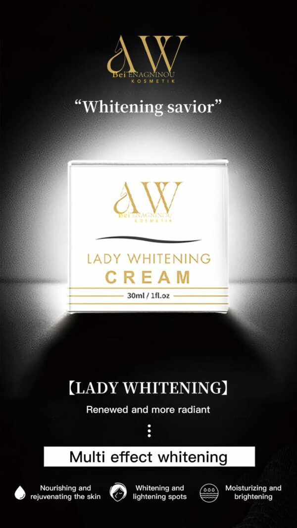 The Lady Whitening Cream is light and tender, velvety-like delicate, easy to push and fit the skin, improving dullness from inside to outside, effective- ly moisturizing and whitening the skin, tenderly caring for the skin, soothing the skin, nourishing the skin fully, making the skin delicate and shiny.